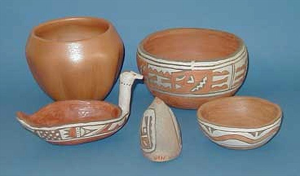 The potters of Santa Ana often return to their old pueblo on the north bank of the Jémez River to collect red clay, which they temper with sand from the river. They slip their pots with white or buff, and paint them with simple old designs, mostly geometrics or abstract images of clouds, flowers, and sometimes turkey eyes. Santa Ana potters use a lot of red paint in decorating their pots, with or without the black outline customary at other pueblos. They paint the bases of their pots red as well as the insides of the rims, which they encircle with a thin band that often has a line break. They paint thick lines and strong shapes on the bulging part of the pot between the two.
