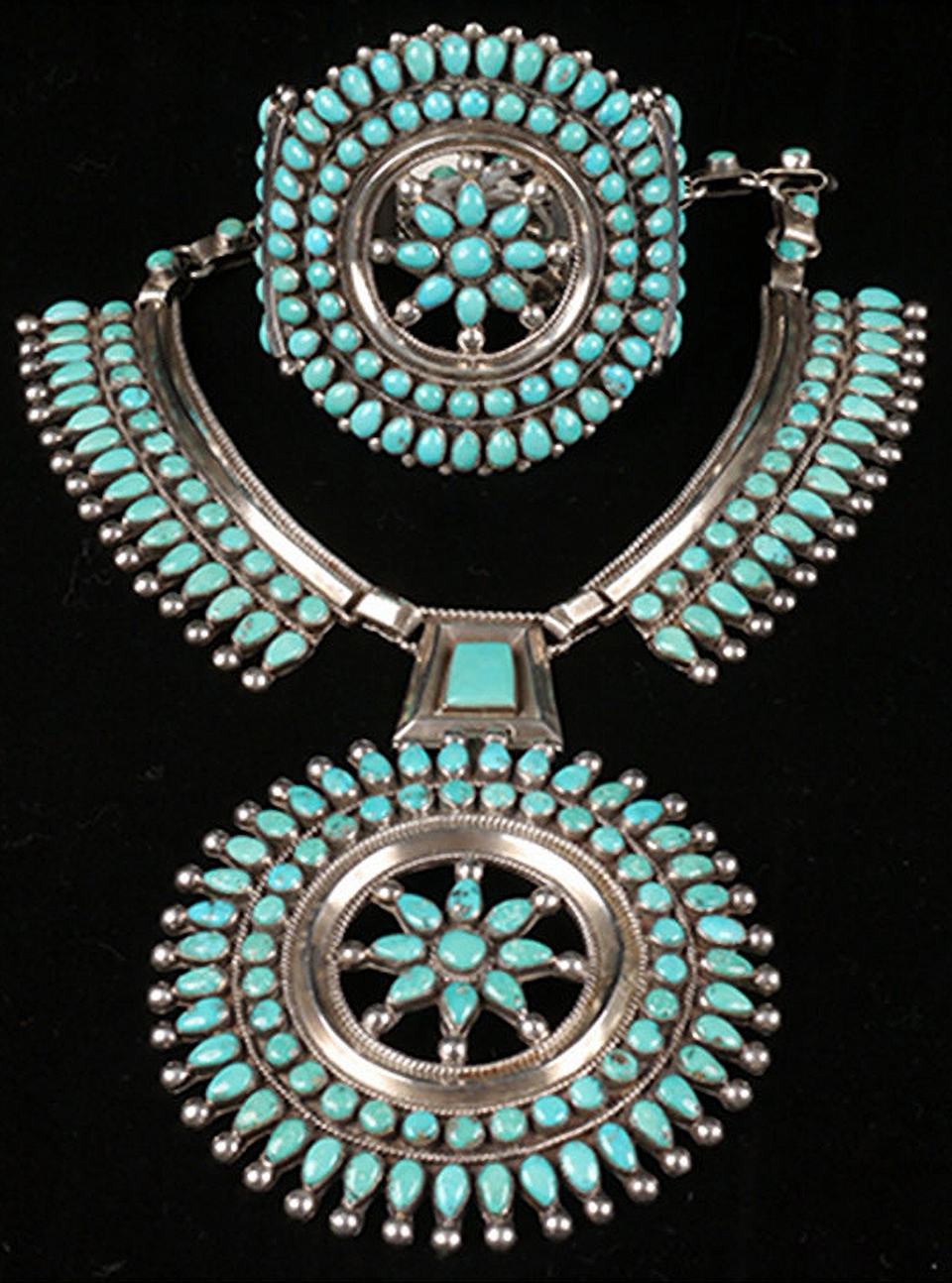 Considered the most traditional of all of New Mexico’s Pueblos, the Zuni people have a unique language, culture and history that is the result of their geographic isolation. With perhaps 80% of the workforce involved in making arts, Zuni is indeed an “artist colony. They express their cultural traditions through art, particularly through painting, pottery, jewelry and fetish carving. Zuni people have been skilled lapidary artisans since ancient times and contemporary Zuni jewelers have taken the art of silver and stone decorative jewelry to another level. They are known for making Needlepoint (tiny needle shaped stones), Pettipoint (tiny round, oval or square stones) and turquoise inlaid jewelry since the early 20th century. Today’s Zuni jewelry is some of the most popular silver and stonework in the southwest with a unique look which can be easily spotted by collectors and jewelry connoisseurs alike. While many Native people carve fetishes or animal representations from a variety of substances, Zuni small carvings are of animals and icons integral to the Zuni culture. Extremely popular to collectors and as wearable art, contemporary Zuni animal carvings are not correctly described as fetishes. Personal fetishes have been blessed and are never sold, but instead carefully cared for. Much can be learned about Zuni culture and art at the A:shiwi A:wan Museum & Heritage Center on the Pueblo.